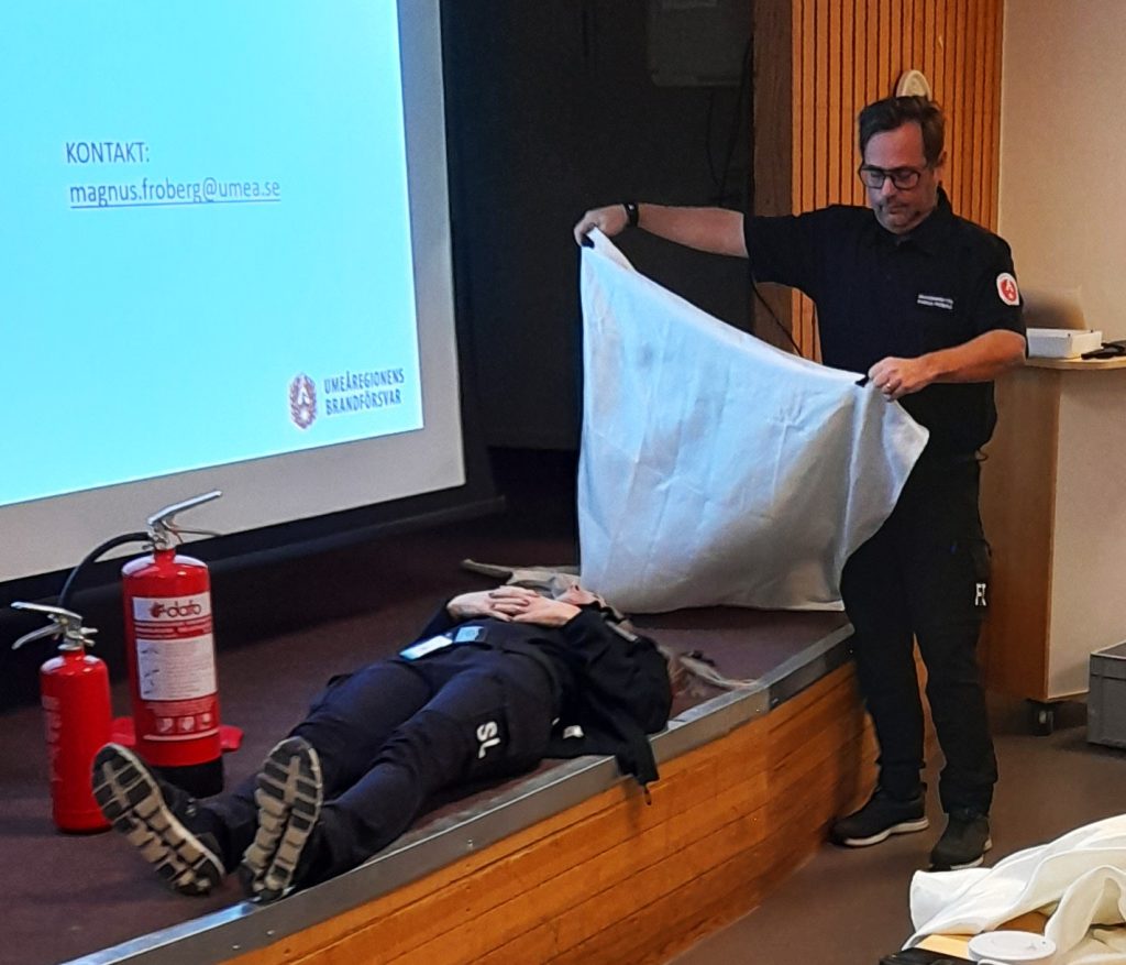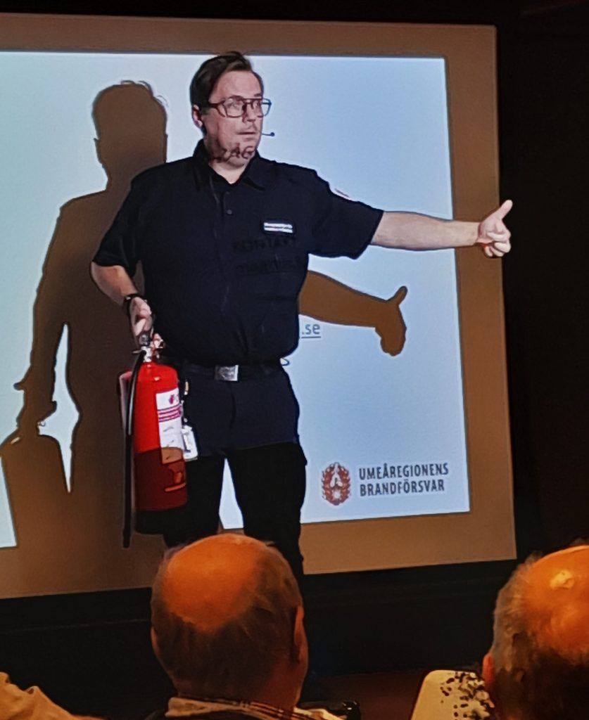 Magnus Fröberg, brandingenjör, poängterade från början att brand sprider sig fort; för att illustrera visade han en kort video där en mobil med laddare på ett nattduksbord tog eld, och på mindre än en halv minut var branden utom kontroll för en brandfilt, något senare även en handbrandsläckare och på mindre än fem minuter var det en fullt utvecklad brand. Magnus poängterade att de tre viktigaste sakerna att se till att man har där hemma är brandvarnare, brandfilt och en handbrandsläckare. Man bör ha flera varnare och placerade på ett sätt så de täcker våningen/huset. Man kan med fördel ha sammankopplade varnare så att när en går igång startar även de andra. Man kanske inte hör den längst bort när man sover i ett rum med stängd dörr. Det är viktigt att kolla att man hör brandvarnare i sängen (sovande!) med hörapparaten avtagen. Om inte så kontakta hörcentralen för ytterligare hjälp med detta. Det finns hjälpmedel.
