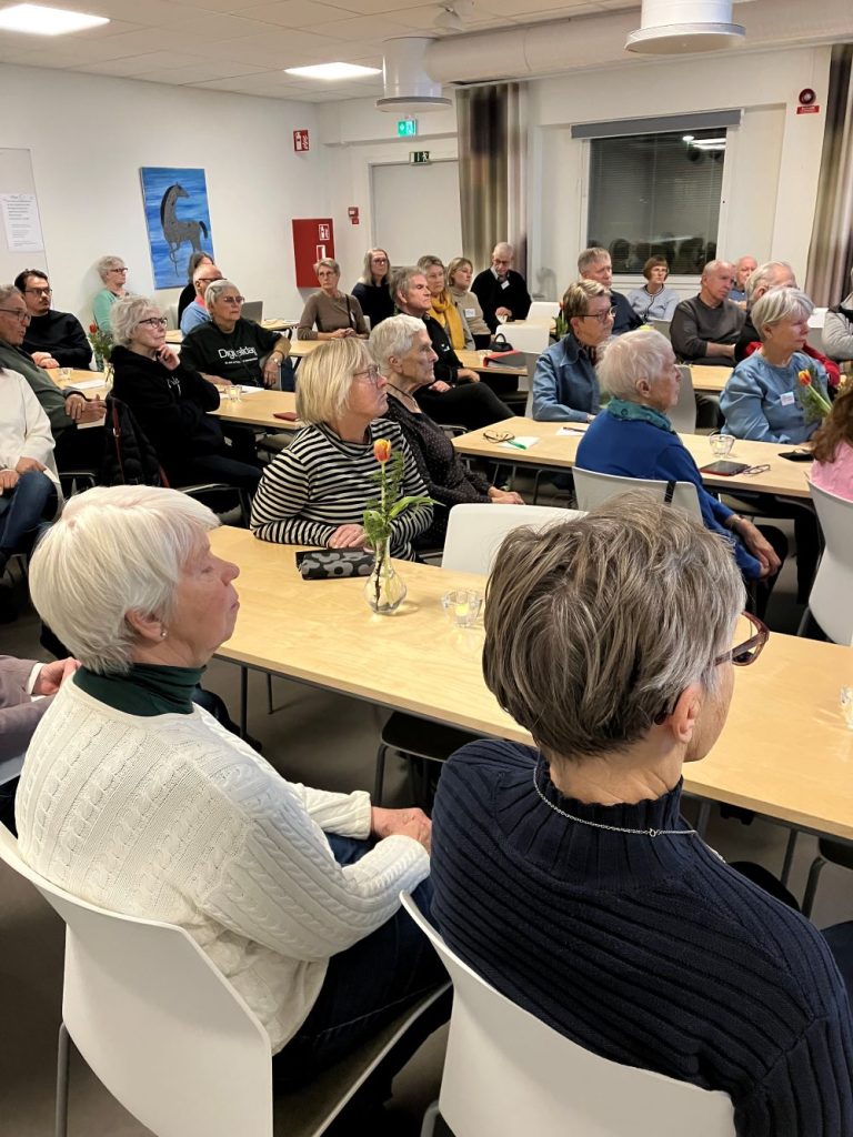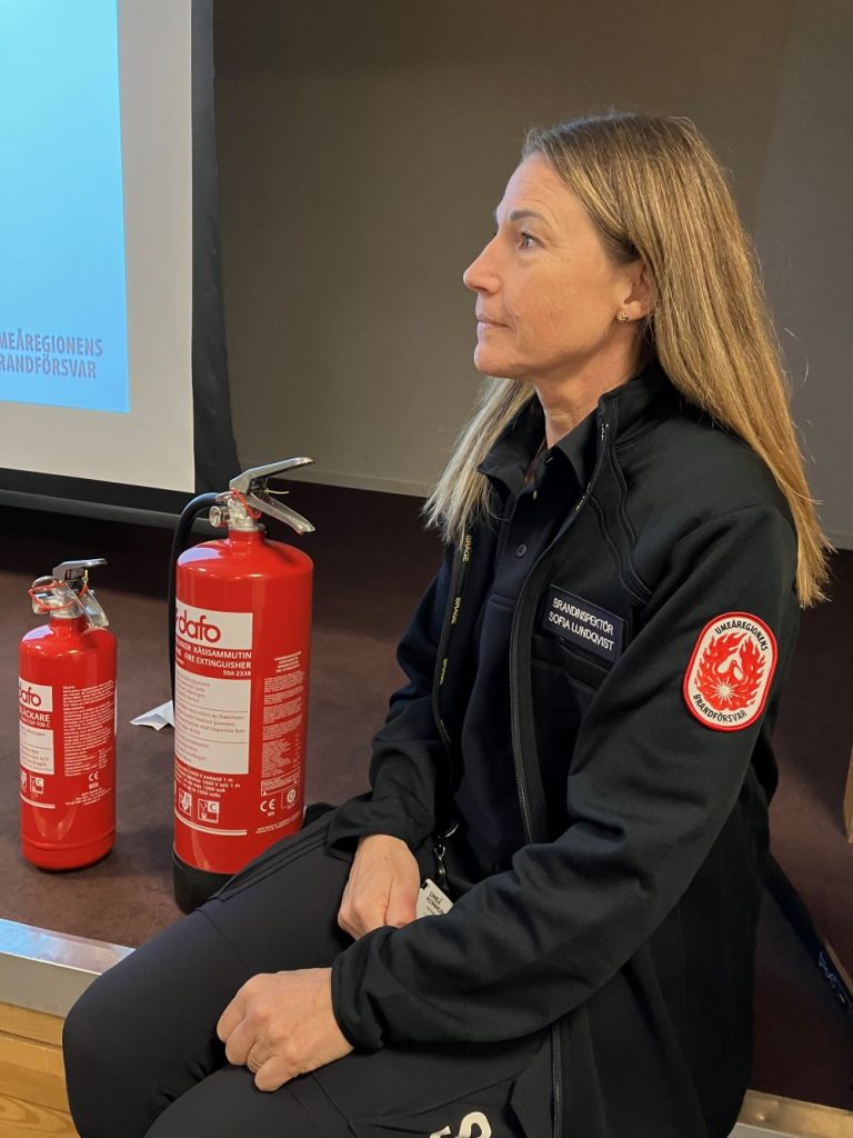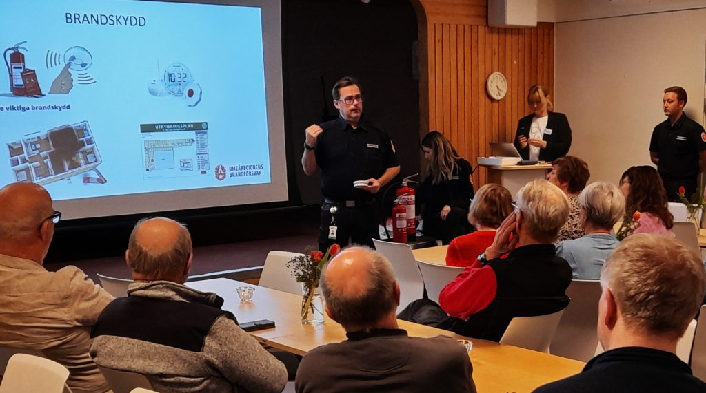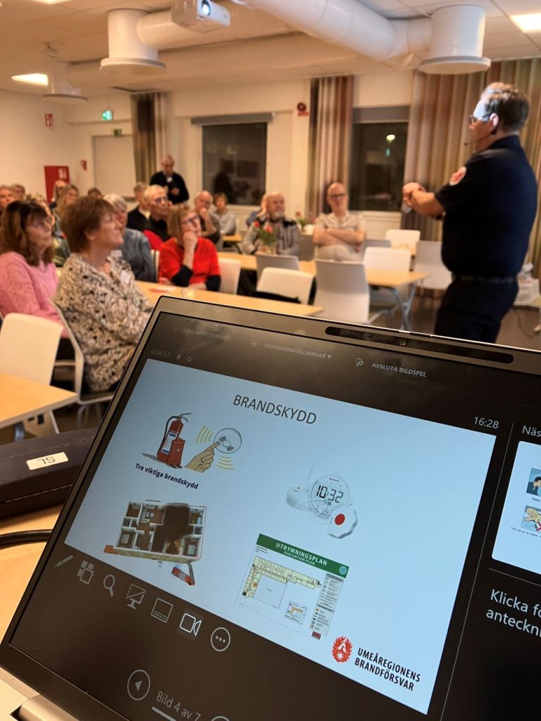 Frivilligcentralen hade samlat sina volontärer till en informationsträff om brandskydd i hemmet. Umeåregionens brandförsvar hade ”ryckt ut” med tre personer för att sköta detta, och det blev en eftermiddag med mycken nyttig information som inte bara gällde det egna hemmet utan också att ta med till de äldre personer som volontärerna besöker. Under kvällen fanns två skrivtolkar från Tolkcentralen på plats. Allt som sades i rummet kom upp som text på en stor skärm, något som kan vara till stor hjälp för personer med hörselnedsättning.