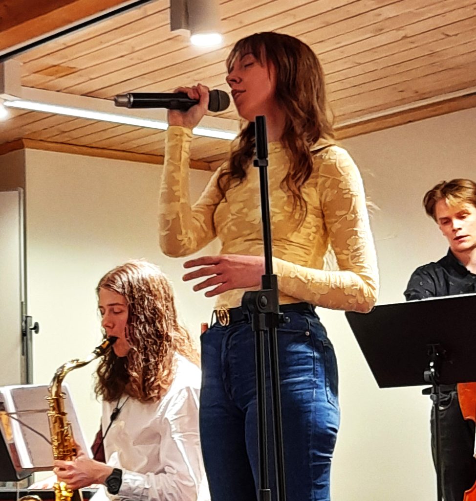 Tyra Bäckström har satt ihop en sextett bestående av elever från Kulturskolans äldsta jazzgrupp. Nu fick de chansen att göra sin första spelning på Sjuan, och publiken tog dem till sig, applåderade solonen likväl som att fötter stampade och huvuden nickade i takt. Gruppen började eftermiddagen med Dizzie Gillespies ”Night in Tunisia” och på sedvanligt sätt i inledningar fick alla en chans att visa upp sig på en gång. Därmed var publiken vaken och med på ”noterna”!