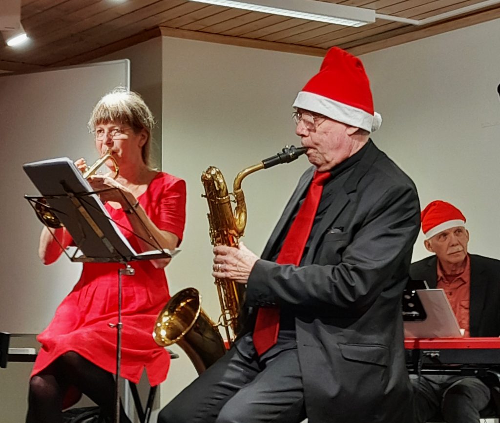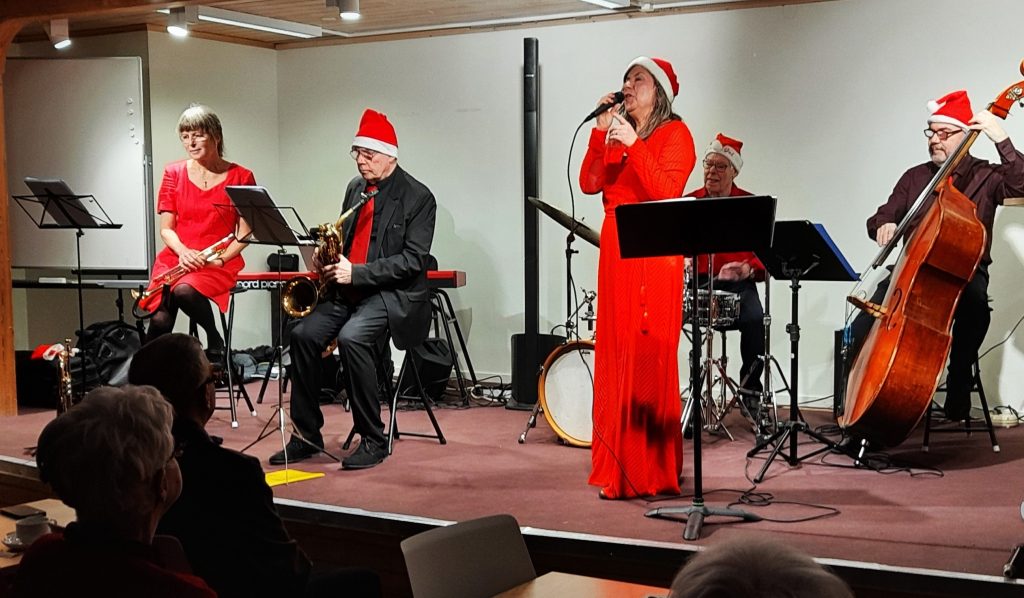 Sten Öbergs orkester bjöd på jazzig julmusik på säsongens sista swingcafé på Sjuans mötesplats. Redan som andra låt kom Let it snow, let it snow, och när publiken tågade ut efter sista låten så visst hade man blivit bönhörda – det hade kommit 3 cm nysnö!